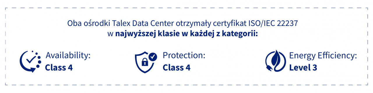 O jakości obiektów Talex Data Center świadczy też fakt, że otrzymały one certyfikat ISO/IEC 22237:2021 w najwyższej klasie w każdej z kategorii: