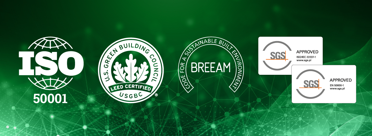 - ISO 50001 – system zarządzania energią, potwierdzający, że centrum systematycznie optymalizuje zużycie energii.